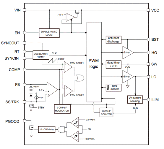 ✦ 輸出電壓監(jiān)控電路:如果輸出電壓測量值在目標(biāo)值的87%以上,就會(huì)發(fā)送PGOOD 電源良好信號(hào)。