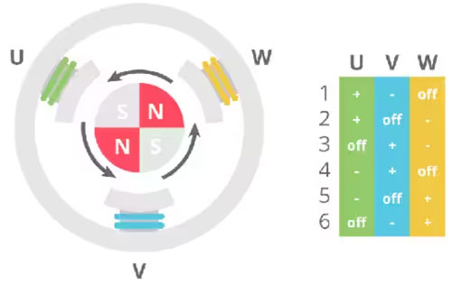 圖 1:BLDC 電機(jī)的 6 步換向模式:(圖片來源:CUI Devices)