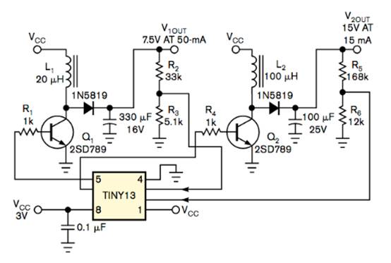 圖 2 Atmel Tiny13 AVR 微控制器使用其內(nèi)部 ADC 和 PWM 調(diào)節(jié)兩個(gè)升壓直流/直流轉(zhuǎn)換器輸出。