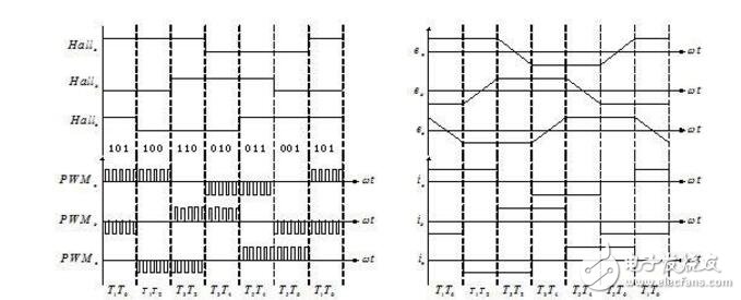 圖2: Hall狀態(tài)與PWM、三相反電動(dòng)勢、三相電流的對應(yīng)關(guān)系