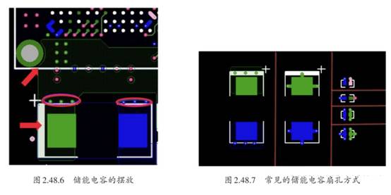 儲能電容的作用就是保證IC在用電時,能在最短的時間內(nèi)提供電能。儲能電容的容值一般比較 大,對應(yīng)的封裝也比較大。在PCB中,儲能電容可以離器件遠一些,但也不能太遠,如圖2.48.6所示。常見的儲能電容扇孔方式,如圖2.48.7所示。