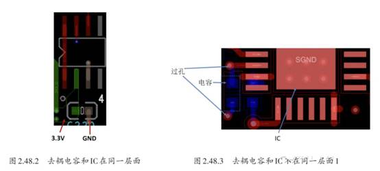(4)保證去耦環(huán)路盡量小。去耦電容常見的擺放示例如圖2.48.2~圖2.48.4所示。圖2.48.2~圖2.48.4所示是SOP封裝的IC 去耦電容的擺放方式,QFP等封裝的與此類似。