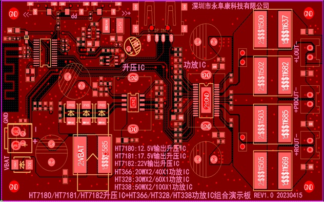 2.HT7180/HT7181/HT7182升壓IC+HT366/HT328/HT338功放IC組合演示板PCB頂層設(shè)計(jì)圖