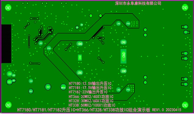 3.HT7180/HT7181/HT7182升壓IC+HT366/HT328/HT338功放IC組合演示板PCB底層設(shè)計(jì)圖