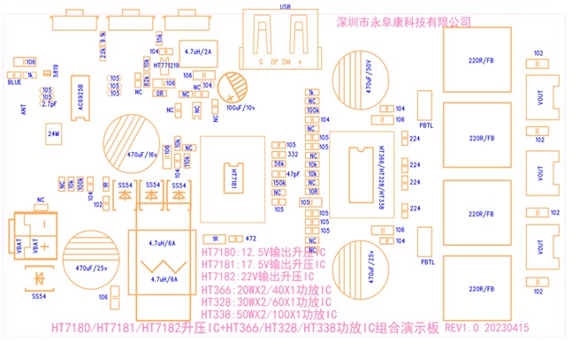 4.HT7180/HT7181/HT7182升壓IC+HT366/HT328/HT338功放IC組合演示板貼片圖