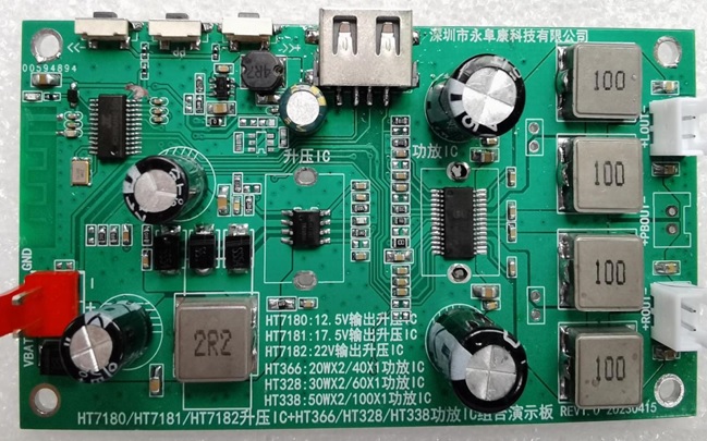 6.HT7180/HT7181/HT7182升壓IC+HT366/HT328/HT338功放IC組合演示板實(shí)物圖