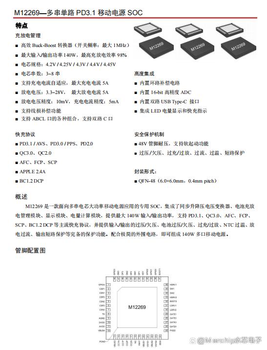 M12269是一款面向3-8串電芯大功率移動(dòng)電源應(yīng)用的專(zhuān)用SOC,集成了同步升降壓電壓變換器、電池充放 電管理模塊、顯示模塊、電量計(jì)算模塊,提供最大 140W 輸入/輸出功率,支持 PD3.1、QC3.0、AFC、FCP、 SCP、BC1.2 DCP 等主流快充協(xié)議,并提供過(guò)壓/欠壓、過(guò)充/過(guò)放、過(guò)溫等完備的保護(hù)功能。配合簡(jiǎn)單的外圍電路,即可組成大功率多口移動(dòng)電源管理方案。 |
