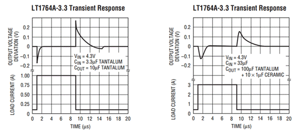 瞬態(tài)響應(yīng)是指電流階躍變化時的輸出電壓變化。它與電容,控制環(huán)路的增益帶寬和負(fù)載電流變化的大小和速率有關(guān)。