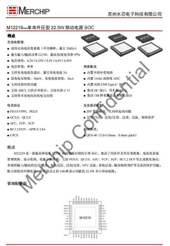 M12218和M12219是一款面向真22.5W移動電源應用的專用SOC,集成了同步開關升降壓變換器、電池充放電管理模塊、顯示模塊、電量計算模塊,支持UFCS(可選)、PD3.0、QC3.0、AFC、FCP、SCP、BC1.2、DCP等主流快充協(xié)議,并提供輸入/輸出的過壓/欠壓、電池過壓、過充/過放、NTC過溫、放電過流、輸出短路保護等完備的保護功能。
