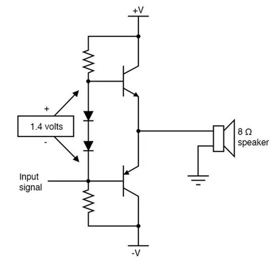 同時(shí)使用正電壓和負(fù)電壓電源的 B 類音頻放大器示意圖。