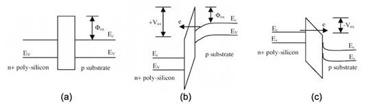 圖 2.具有(a)平帶、(b)正柵極電壓和(c)負柵極電壓的 MOS 晶體管的能帶圖