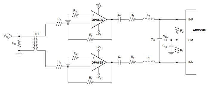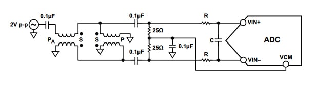 該 ADC 接口使用雙巴倫配置(如下所示)將單端輸入轉(zhuǎn)換為差分信號。