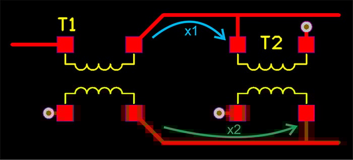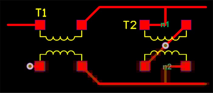 圖 5 顯示了該電路的另一種布局。在這種情況下,連接 T1 和 T2 的走線運(yùn)行到中點(diǎn)(上路徑為 n1,下路徑為 n2),然后連接到 T2 的相應(yīng)焊盤。這使得兩條路徑相同。此外,請注意對稱走線用于 T2 的兩個接地焊盤。