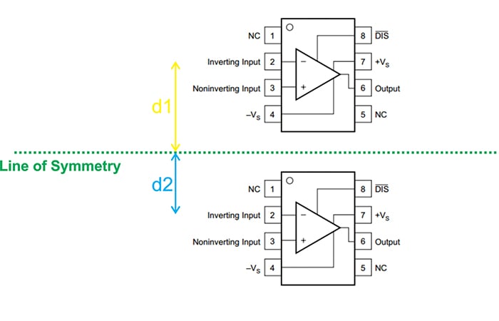但是,非對稱包不是這種情況。例如,考慮一個采用 SOIC-8 封裝的運(yùn)算放大器。如圖 7 所示,相對于一條對稱線放置其中兩個封裝不會創(chuàng)建對稱布局。在此示例中,與下部運(yùn)算放大器的反相輸入相比,上部運(yùn)算放大器的反相輸入更遠(yuǎn)離對稱線。換句話說,d1 > d2。