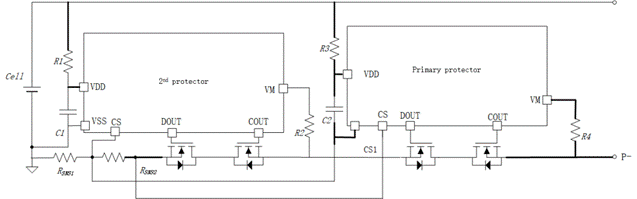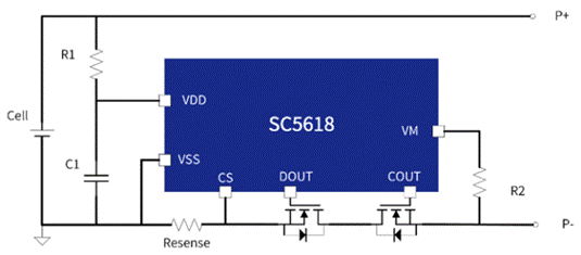 SC5618 系列保護(hù)芯片支持兩組芯片串聯(lián)使用,從而實(shí)現(xiàn)對鋰電池的初級保護(hù)和次級保護(hù),增強(qiáng)系統(tǒng)的魯棒性。