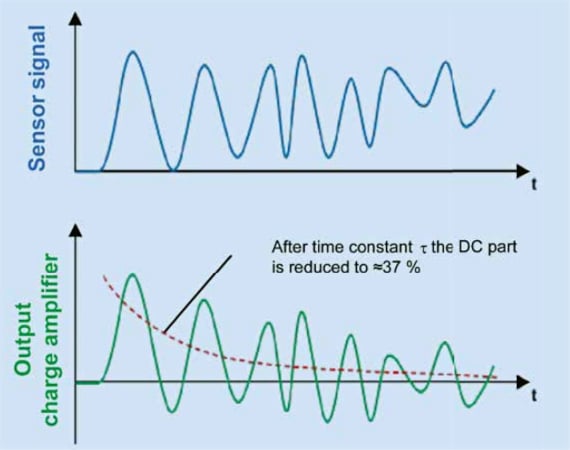 如您所見,經(jīng)過一個 $$ au$$ 的時間間隔后,輸出的 DC 值減少到其初始值的 37%。對于某些類型的電荷放大器,可以在不同的反饋電阻值之間切換,以根據(jù)加速度信號的低頻內(nèi)容調(diào)整時間常數(shù)參數(shù)。
