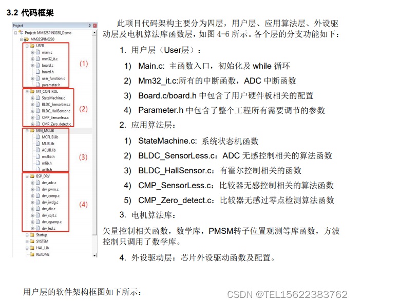 2. 硬件參考設(shè)計(jì)硬件系統(tǒng)由外部 DC 電源供電, 經(jīng)降壓后得到 12V 給 Gate driver IC 供電以驅(qū)動(dòng)功率開(kāi)關(guān)管,12V 通過(guò)降壓 IC 輸出 5V 給 MM32 SPIN 系列微處理器及其他功能模塊供電。通過(guò)外部電路檢測(cè)反電動(dòng)勢(shì)過(guò)零點(diǎn)信號(hào),對(duì)應(yīng)六種不同的逆變器 MOS 管驅(qū)動(dòng)順序,實(shí)現(xiàn) BLDC 電機(jī)的六步換相。采用 0~5V 的電壓輸入做為速度命令的來(lái)源, 以控制電機(jī)轉(zhuǎn)速。 用戶(hù)轉(zhuǎn)動(dòng)可變電阻旋鈕可以改變此輸入電壓值,實(shí)現(xiàn)無(wú)極調(diào)速。圖 2 是 MM32SPIN0280 方案硬件框圖