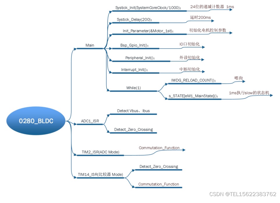 由圖可知,系統(tǒng)上電復(fù)位后,先執(zhí)行一段延時(shí)函數(shù),等待系統(tǒng)穩(wěn)定后開(kāi)始初始化系統(tǒng)外設(shè) 及參數(shù),最后使能對(duì)應(yīng)的中斷,在 while 循環(huán)中執(zhí)行喂狗及 1ms 一次的慢速環(huán)狀態(tài)機(jī)。 1) ADC 法檢測(cè)過(guò)零點(diǎn)時(shí),在 ADC1 中斷執(zhí)行過(guò)零點(diǎn)檢測(cè),在 TIM2 中執(zhí)行延時(shí)和換相。 2) 比較器法檢測(cè)過(guò)零點(diǎn)時(shí),在 TIM14 中斷執(zhí)行過(guò)零點(diǎn)檢測(cè),并執(zhí)行延時(shí)和換相。