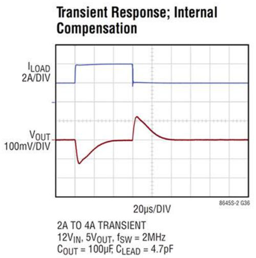 這些開關(guān)穩(wěn)壓器的設(shè)計還能夠改進瞬態(tài)響應(yīng)。它們提供清晰、精密的調(diào)節(jié)(盡管負(fù)載變化),并可在各種不同工作條件下保持回路穩(wěn)定性(圖 4)。為了增加靈活性,LT8646S 器件還允許外部電阻-電容器 (RC) 補償,讓設(shè)計人員能夠優(yōu)化瞬態(tài)響應(yīng)。