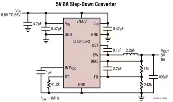 但是,隨著最近的技術(shù)進步和創(chuàng)新拓?fù)浣Y(jié)構(gòu)的問世,這種情況已經(jīng)改變,LT8645S、LT8646S 和 LT8645S-2 就證明了這一點。這三款相似的 65 V 單片 Silent Switcher 同步降壓穩(wěn)壓器來自于 Analog Devices,每款穩(wěn)壓器都能夠支持 8 A 輸出(圖 1)。