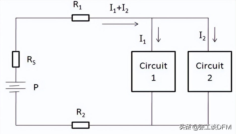 下圖顯示了通過共模阻抗進(jìn)行的噪聲去耦。電路1和電路2通過同一根導(dǎo)線獲得電源電壓的和接地環(huán)路。如果其中一個電路的電壓突然需要提高,另一個電路將降低,因?yàn)楣搽娫春蛢蓚回路之間的阻抗。