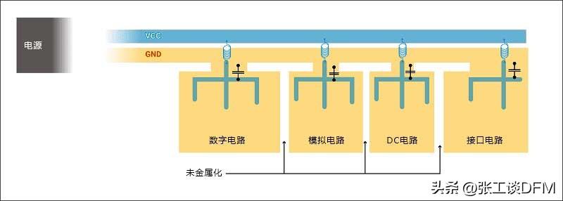 下圖說明了如何使用分段將四個不同的電路分開。地平面使用未金屬化的護(hù)城河/通道有效地隔離了電路。電感和電容對每個電路進(jìn)行濾波,電源層之間的耦合減少。