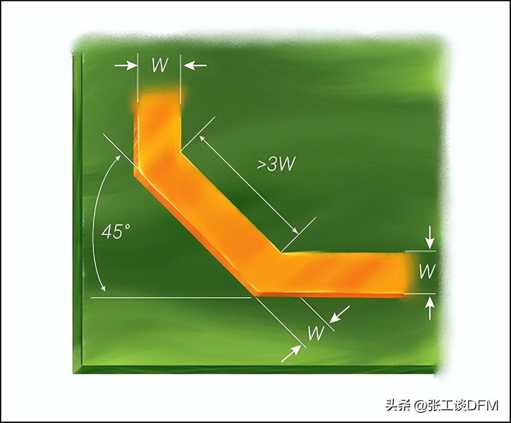 與過孔類似,不應(yīng)實(shí)施直角 90° 軌道轉(zhuǎn)彎,因?yàn)樗鼤黾蛹纳娙,?dǎo)致特性阻抗發(fā)生變化,從而導(dǎo)致反射。如圖 所示,所有正交走線都應(yīng)采用 45° 彎曲,以限制耦合到附近走線的噪聲。