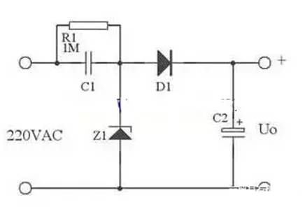 在實(shí)際應(yīng)用中,可以用下圖代替上圖,這里用了Z1正向特性和反向特性,其反向特性(也就是其穩(wěn)壓特性)來(lái)穩(wěn)定電壓,其正向特性用來(lái)在市電負(fù)半周給C1提供放電回路。