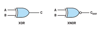 CD4007是一款多功能IC。例如,單個CD4007可用于構(gòu)建三個反相器、一個反相器加上兩個傳輸門或其他復雜的邏輯功能,如NAND和NOR門。反相器和傳輸門尤其適合構(gòu)建傳輸門XOR和XNOR邏輯功能。XOR和XNOR邏輯門的示意圖符號如圖2所示。