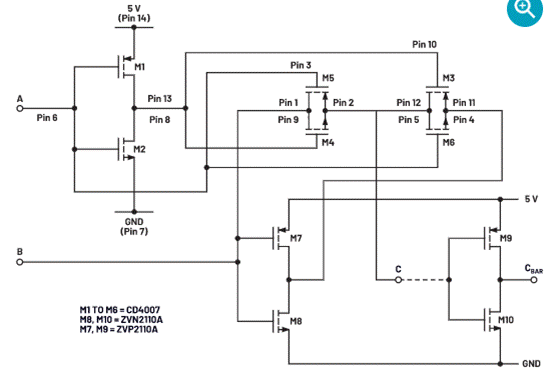 電路中有兩個邏輯輸入A和B。同相XOR輸出位于節(jié)點C,而該輸出的反相位于節(jié)點CBAR以形成XNOR函數(shù)。