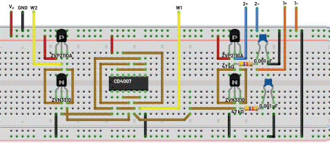 使用四個獨立NMOS和PMOS晶體管(ZVN2110A和ZVP2110A)構(gòu)建的反相器對也可以由第二個CD4007 IC構(gòu)成,或者可以是采用六路反相器IC的CMOS反相器,如74HC04或CD4049。CD4066四通道SPST開關也可以作為采用CD4007構(gòu)建的開關的替代器件。