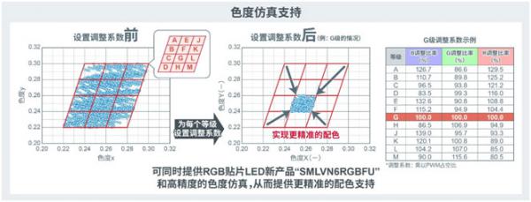 SMLVN6RGBFU為每個色度等級設(shè)置了調(diào)整系數(shù),并提供更接近目標(biāo)顏色的配色支持。通過同時提供RGB貼片LED新產(chǎn)品和高精度的色度仿真,可以實現(xiàn)更精細(xì)的配色效果。