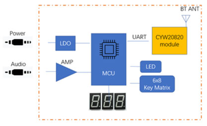 圖示3-大聯(lián)大品佳基于Infineon產(chǎn)品的藍(lán)牙音樂燈控發(fā)射器方案的方塊圖