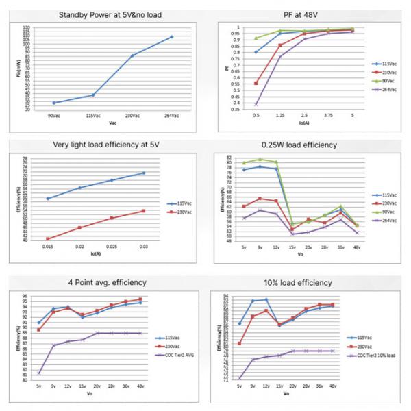 該方案在230Vac和5V輸出沒接負(fù)載的情況下,輸入功率小于100mW, 待機(jī)功耗及48V下PF曲線如下圖。在5V小負(fù)載下的效率及各個(gè)輸出下0.25W的效率也很好。在115 VAC(藍(lán)色曲線)和230 VAC (紅色曲線)輸入電壓的平均能效和輕載(10%負(fù)載)能效,從下面曲線圖可看到都遠(yuǎn)高于COC V5 Tier 2平均能效標(biāo)準(zhǔn)和COC V5 Tier 2輕載能效標(biāo)準(zhǔn),由于PFC在5V,9V,12V時(shí)停止工作,所以可以看到這幾個(gè)電壓下效率較高,28V和48V滿載下的效率也非常高。