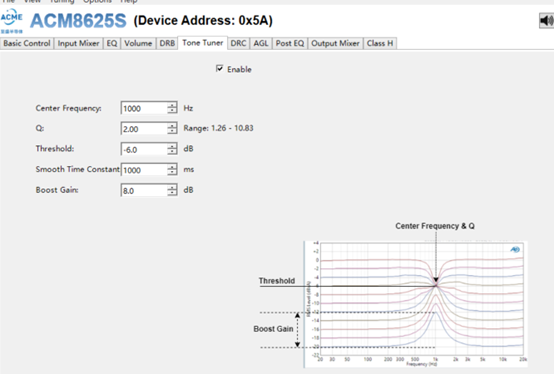 除了材料的改變,至盛音頻功放DSP中的模塊提供了Tone Tuner可以針對(duì)分割震動(dòng)做電信號(hào)的優(yōu)化。在8625P/8625S產(chǎn)品中增加了Tone Tuner模塊。下面對(duì)這個(gè)模塊的幾個(gè)參數(shù)做下解釋。