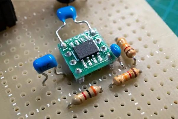 完成的DC-DC轉(zhuǎn)換器的背面。在表面上安裝了DIP器件,在焊接面上安裝了線圈。要實(shí)際安裝的元器件很少,只需要電阻器、幾個(gè)電容器和1個(gè)線圈即可使用開關(guān)穩(wěn)壓器制作DC-DC轉(zhuǎn)換器。