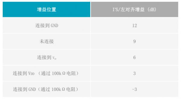 表 1. MAX98360  的 I2S/左對(duì)齊增益設(shè)置。