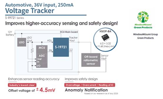 美蓓亞三美株式會社(MinebeaMitsumi Inc.) 旗下的艾普凌科有限公司(ABLIC Inc.,總裁:田中誠司,總部地址:東京都港區(qū),下稱“ABLIC”)今天推出了車載用電壓跟蹤器S-19721系列。