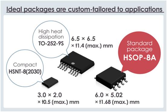 即備有標準封裝的HSOP-8A,還備有可高散熱封裝 的TO-252-9S和小型封裝的のHSNT-8(2030)。
