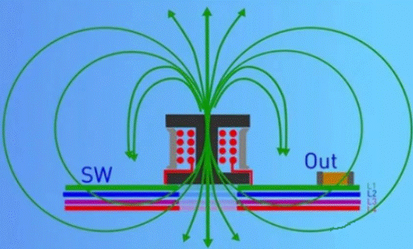 當(dāng)Boost升壓正常工作時(shí),電感中流過負(fù)載電流,形成回路。由于開關(guān)管的存在,電流是動(dòng)態(tài)變化的,由此可形成電感的磁感線,在導(dǎo)體的表面部分磁感線回形成封閉的磁回路,部分磁路會(huì)形成漏磁溢出到空氣中。如果電感底部沒有敷銅時(shí),從電感中溢出的磁感線會(huì)在整個(gè)電源系統(tǒng)中存在,使系統(tǒng)沒有相對(duì)安靜的空間,會(huì)造成EMI的性能下降。