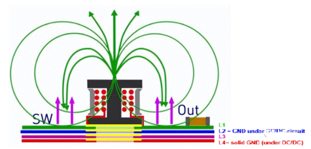 在EMC方面來(lái)看,在電感底部鋪銅,完整的地平面鋪銅有利于EMI的設(shè)計(jì);現(xiàn)在的電感的生產(chǎn)工藝升級(jí),電感采用屏蔽型電感,泄露的磁感線很少,對(duì)電感的感量影響不大,還能有利于散熱。