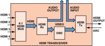 以 ADV7623 為例,這款 HDMI 收發(fā)器集成了 4:1 HDMI 輸入多路復(fù)用器 (mux )、 HDMI 接收器、 屏幕顯示 (OSD)引擎和 HDMI 發(fā)射器。就個體而言, 上述每種功能應(yīng)該都需要彼此 獨(dú)立的 IC 及五花八門的固件,但一個收發(fā)器就可以將全部功能組合到一個綜合解決方案中, 節(jié)省了板載面積、降低了固件 復(fù)雜程度、縮減了物料成本, 為家庭影院系統(tǒng)設(shè)計(jì)人員帶來了 極大方便。