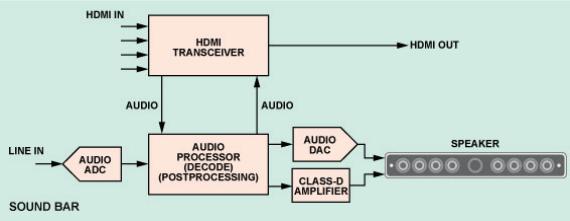 隨著超薄大屏幕平板電視的日益普及,新興的 SOUNDBAR 音 箱成為一種補(bǔ)充性的影音系統(tǒng)。這種音響系統(tǒng)結(jié)構(gòu)緊湊、安裝 方便, 音質(zhì)遠(yuǎn)遠(yuǎn)高于電視揚(yáng)聲器。大部分 HTiB 和 SOUNDBAR 音箱都與大屏幕 HDTV 配套使用, 因此其音頻和視頻連接主要采用 HDMI 接口。 SOUNDBAR 音箱一般都擁有多個 HDMI輸入端用于各種信號源,擁有一個 HDMI 輸出端用于連接電視,同時內(nèi)置音頻處理系統(tǒng)和揚(yáng)聲器。圖 3 所示為典型的 SOUNDBAR 音箱系統(tǒng)。
