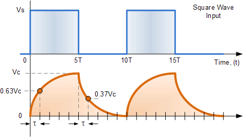 根據(jù)輸入電壓,電容器兩端的電壓降在充電至Vc和放電至零之間交替。在此示例中,輸入方波電壓波形的頻率(以及由此產(chǎn)生的時(shí)間周期f = 1/T )與5RC時(shí)間常數(shù)的兩倍完全匹配。