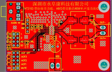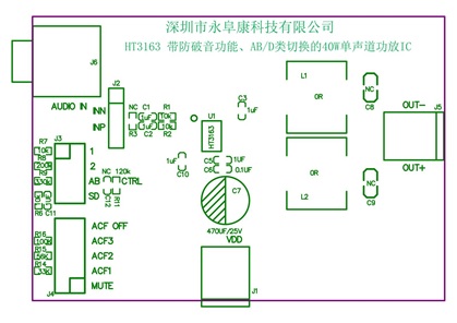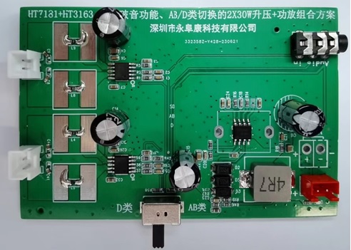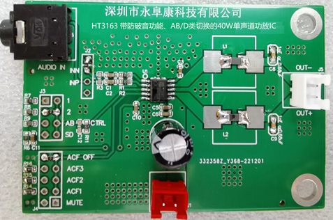 2,采用帶AB/D類切換功能的單聲道40W功放芯片HT3163(立體聲應用采用2顆),能夠完全避免FA/AM收音干擾。兩節(jié)鋰電供電升壓到16V輸出2*30W;3節(jié)鋰電或鉛酸電池升壓18V輸出2*40W;