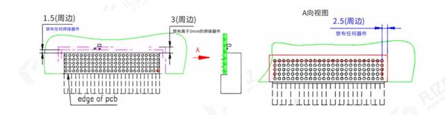 2)彎/公、彎/母壓接連接器與壓接件同面,壓接件周邊3mm不得布局任何的高器件(大于3mm),周邊1.5mm不得布局任何的焊接件,在壓接件的背面,距離壓接件的管腳2.5mm范圍內(nèi)不得布局任何的元器件,如圖1-2。
