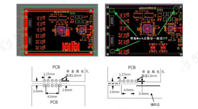 14)板邊5mm內(nèi)沒貼片器件可不加5mm傳送邊,以節(jié)約板材,但是如果有,直接建議客戶進(jìn)行添加工藝輔助邊;一般長(zhǎng)邊做傳送邊,短邊與長(zhǎng)邊比大于80%時(shí),短邊也可做傳送邊。器件布局不能滿足傳送邊寬度要求(板邊5mm禁布)時(shí),應(yīng)該采用加輔助邊的方法。添加輔助邊的寬度一般要求:無需拼板的PCB輔助邊的寬度為5mm,拼板的PCB輔助邊的寬度最小為8mm。如果采用郵票孔的拼版方式,請(qǐng)注意郵票孔的參數(shù)設(shè)置。