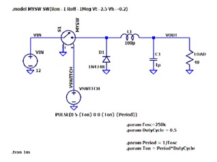 物理轉(zhuǎn)換器電路中的功率開關(guān)通常是場效應(yīng)晶體管。在此模擬電路中,我使用電壓控制開關(guān),其規(guī)格由 .model MYSW SW(...) 語句確定。開關(guān)特性非常有利,但不太理想: