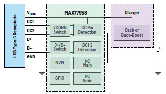 獨立PD控制器的一個示例是MAX77958(圖4)。MAX77958具有兩個獨特功能:非易失性存儲器和直接控制配套充電器的I2C主端口。這兩個功能消除了對外部MCU的需求,也無需開發(fā)定制固件。