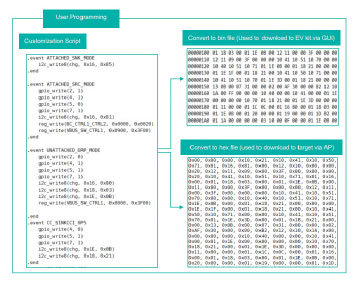 定制腳本是使用簡單、易于使用的命令在GUI中編寫的。該軟件將定制腳本轉(zhuǎn)換為十六進(jìn)制格式,并將其寫入IC配置區(qū)域。開發(fā)人員可以根據(jù)基于其應(yīng)用需要提供的功能來定義簡單的函數(shù)和序列。